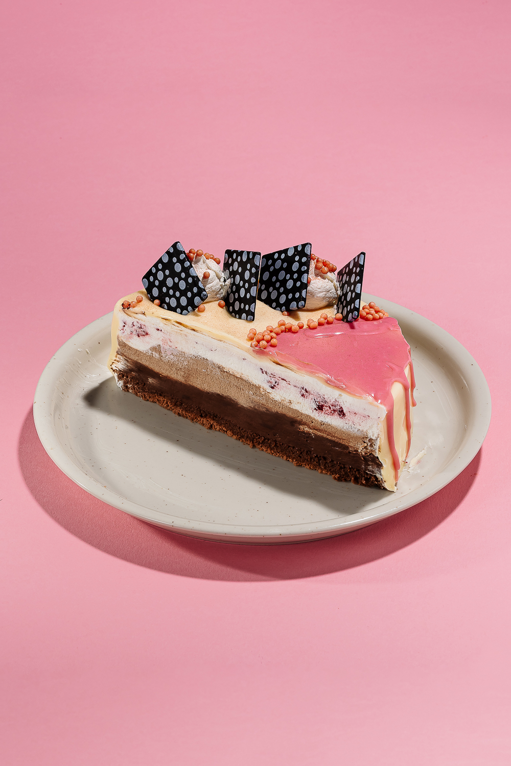 Blat de cacao insiropat, crema cu ciocolata, mousse cu cacao, mousse cu vanilie si zmeura, glazura de ciocolata alba, glazura de ciocolata cu zmeura si diferite forme de ciocolata.